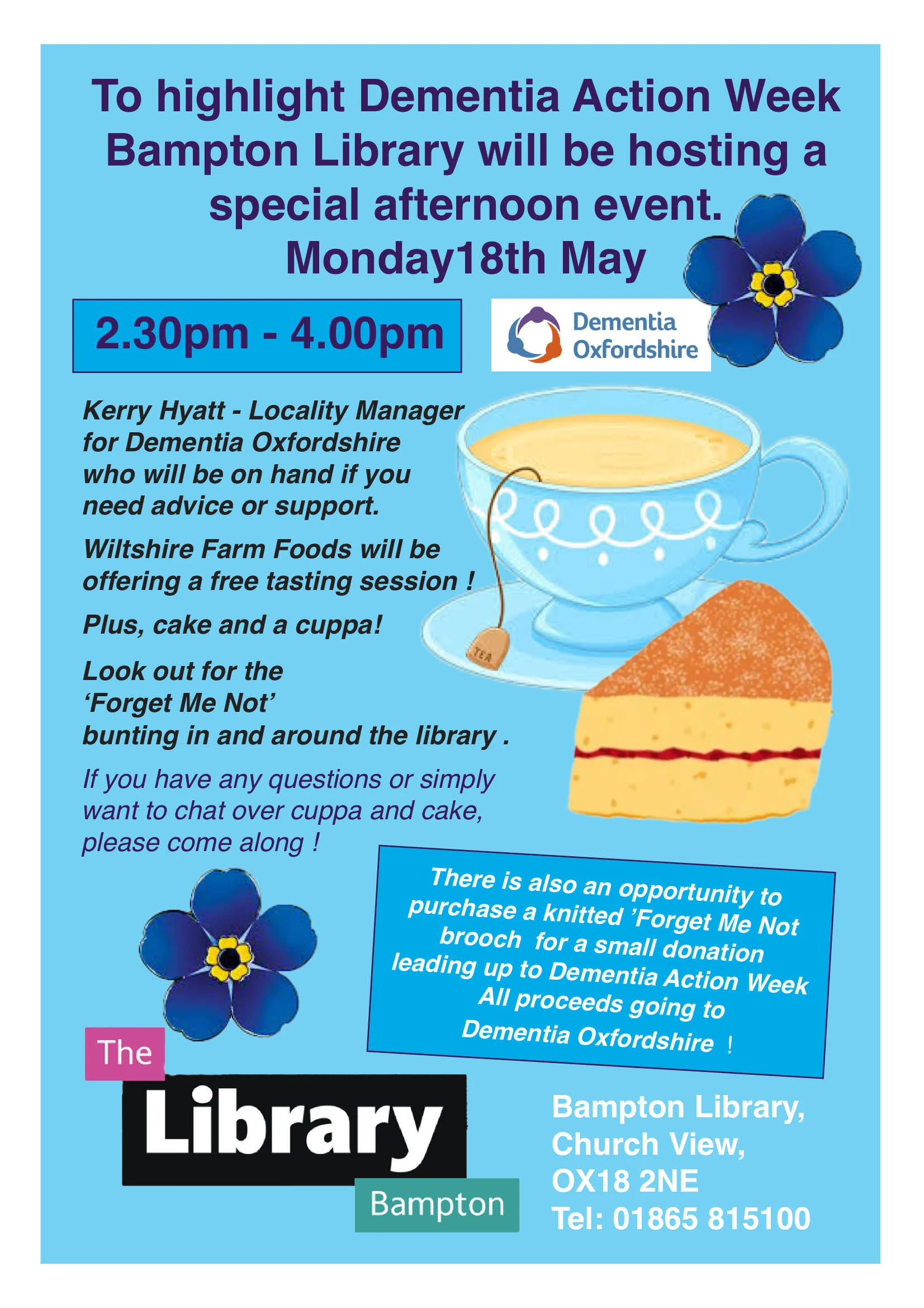 Kerry Hyatt – Locality Manager for Dementia Oxfordshire who will be on hand if you need advice or support. Wiltshire Farm Foods will be offering a free tasting session ! Plus, cake and a cuppa! Look out for the ‘Forget Me Not’ bunting in and around the library . If you have any questions or simply want to chat over cuppa and cake, please come along !