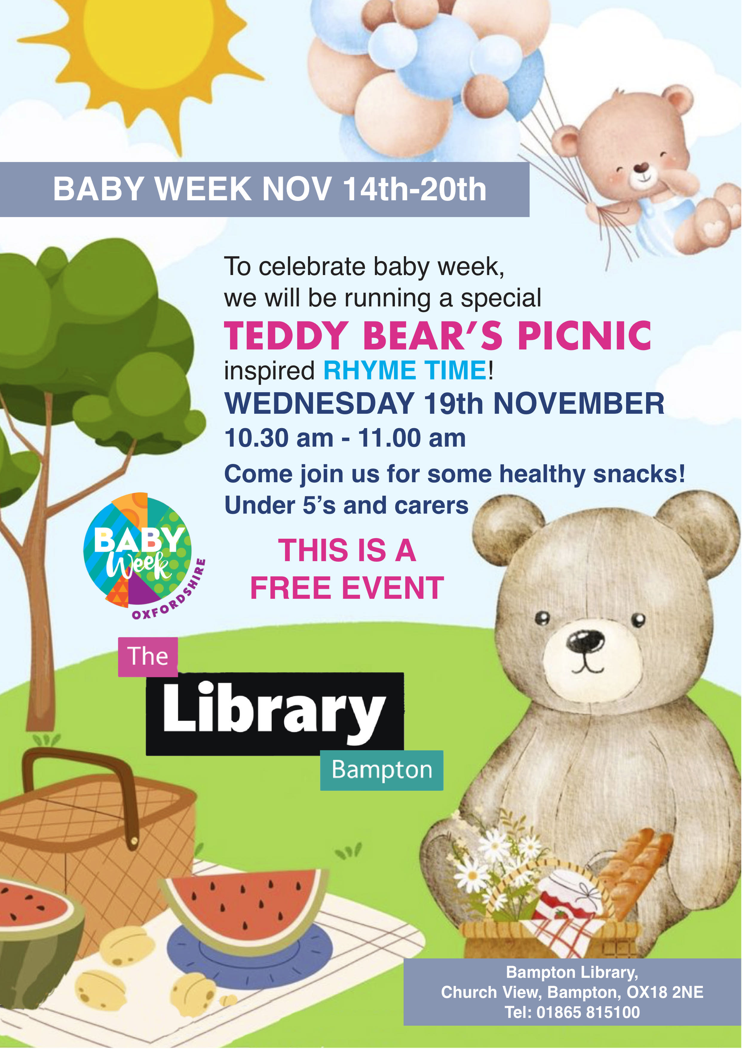 To celebrate BABY WEEK OXFORDSHIRE, we will be running a special TEDDY BEAR’S PICNIC inspired RHYME TIME! WEDNESDAY 19th NOVEMBER 10.30 am – 11.00 am