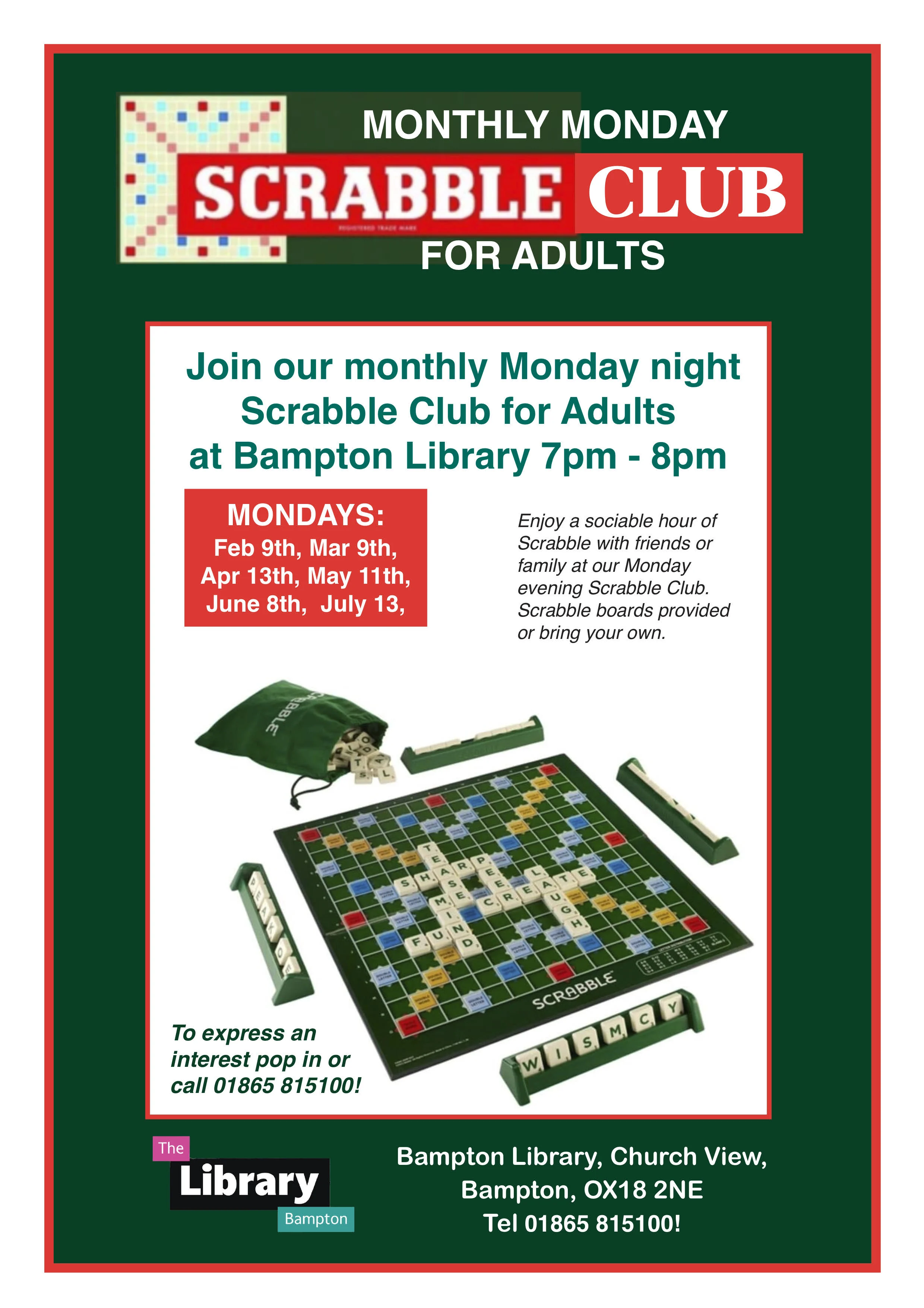 MONDAYS: Feb 9th, Mar 9th, Apr 13th, May 11th, June 8th, July 13, Enjoy a sociable hour of Scrabble with friends or family at our Monday evening Scrabble Club. Scrabble boards provided or bring your own. To express an interest pop in or call 01865 815100!