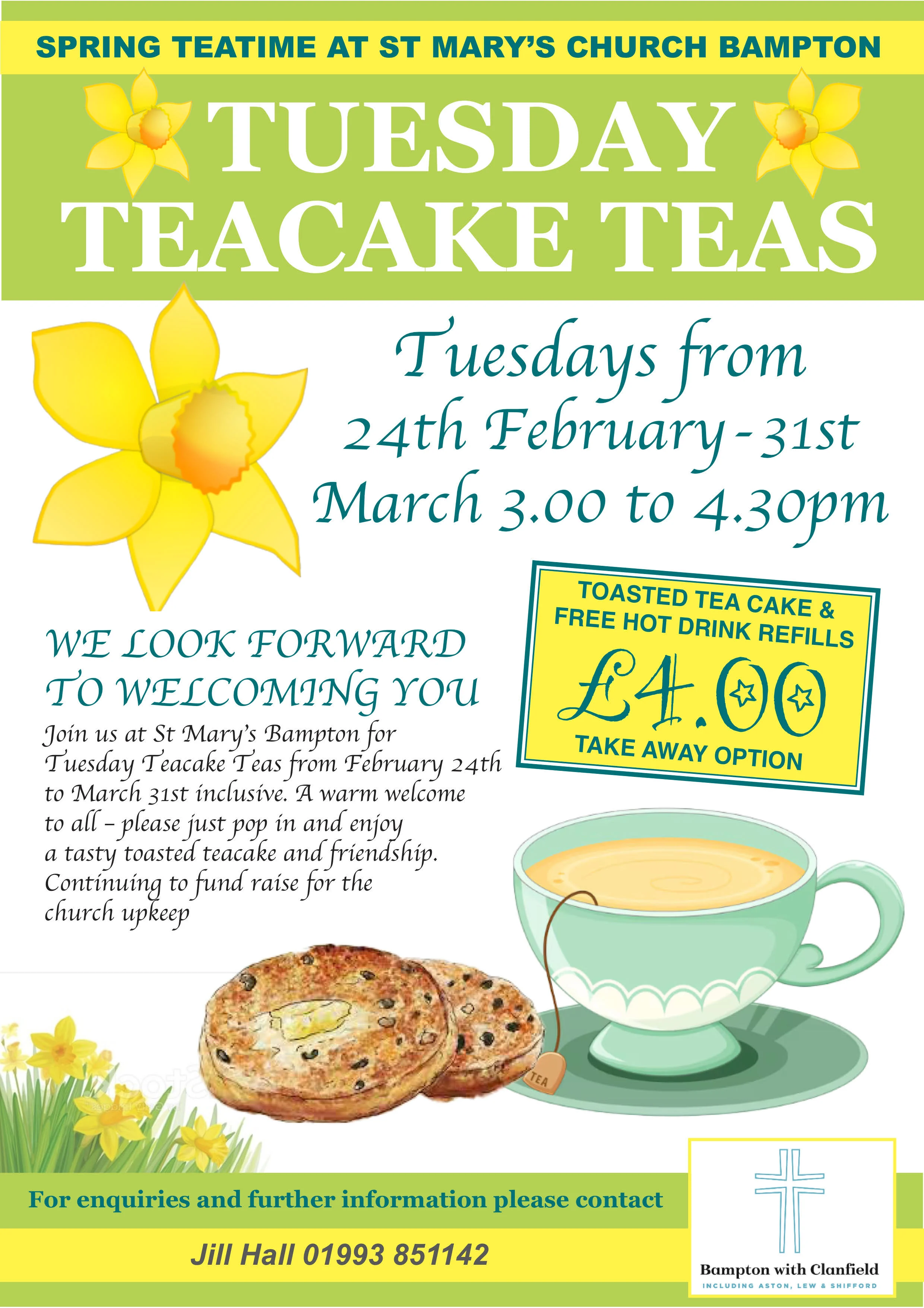 WE LOOK FORWARD TO WELCOMING YOU Join us at St Mary’s Bampton for Tuesday Teacake Teas from February 24th to March 31st inclusive. A warm welcome to all – please just pop in and enjoy a tasty toasted teacake and friendship. Continuing to fund raise for the church upkeep